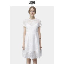 五分袖蕾丝连衣裙USE2017夏装简约通勤X型收腰中长款钩花蕾丝裙OL