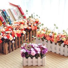 韩式小玫瑰茶玫绢花仿真花假花装饰花艺实木栅栏花盆花器摆件套装
