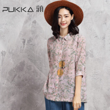 Pukka/蒲牌2017夏装新款原创设计大码女装时尚印花棉麻七分袖衬衫
