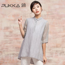 Pukka/蒲牌 春秋装新款原创设计大码女装欧根纱拼接天丝棉麻衬衫