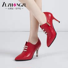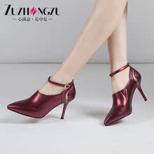 2016春季纯皮女鞋春秋单鞋真皮尖头高跟鞋细跟水钻绑带皮鞋时装鞋
