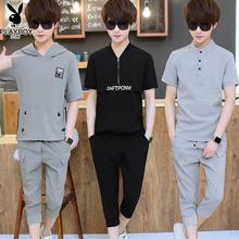 花花公子短袖T恤套装男短裤青少年夏季修身薄款韩版运动服学生装