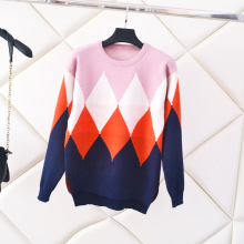 2017秋冬韩版新款菱形格子图案长袖圆领针织衫毛衣打底衫套头外套