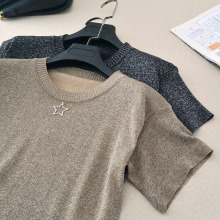 春夏韩版2017新款短袖亮丝波浪领短款修身V领紧身针织T恤女