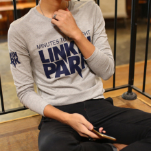 男士春秋长袖T恤纯棉圆领印花体恤潮男装学生上衣打底衫加绒加厚