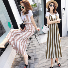 女连衣裤2017新款夏装白上衣条纹吊带连体裤阔腿裤高腰显瘦套装女
