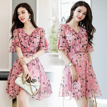 雪纺印花连衣裙2017夏季新款女装韩版修身显瘦A字裙小清新裙子潮