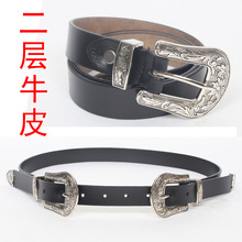 时尚雕花欧美范真皮牛皮双头银色金属扣腰带休闲装饰女士黑皮带