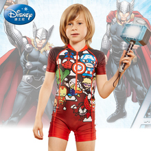 迪士尼儿童泳衣男童连体防晒速干漫威卡通男童度假平角大童游泳衣