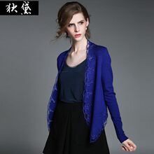 狄黛欧美时尚春秋新款气质百搭蕾丝绣花镶钻垂领外搭针织开衫外套