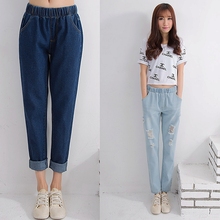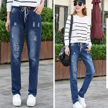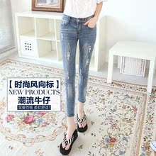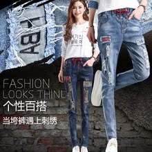 2016秋冬牛仔裤女松紧腰九分裤破洞裤大码显瘦胖mm宽松休闲裤韩版