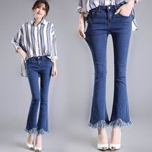 韩版高腰黑色九分喇叭牛仔裤女弹力显瘦流苏须毛边微喇牛仔9分裤