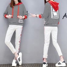 2017春装新款女韩版条纹休闲套装连帽灯笼袖卫衣显瘦小脚裤两件套