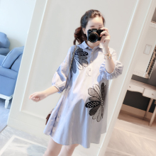 韩版孕妇装春装新款孕妇衬衫裙中长款七分袖上衣宽松条纹连衣裙潮