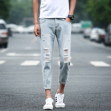 夏季薄款韩版复古修身9分小脚牛仔裤男装九分破洞乞丐裤潮束脚裤