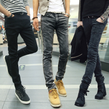 春夏新款男士雪花洗弹力小脚裤青年修身型黑色牛仔裤潮男装长裤子