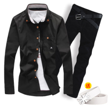 春秋季男式韩版修身长袖衬衫牛仔长裤子一套装休闲潮流衬衣服外套