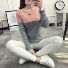 2016秋季新款毛衣女针织衫韩版修身套头一字领拼色短款打底衫上衣