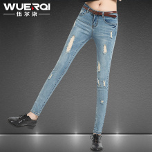 春装新款韩版破洞牛仔裤 女长裤潮弹力修身小脚裤子显瘦铅笔裤
