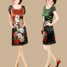 弹力缎真丝裙 新款2017钉珠喷绘花朵裙 大码中长款桑蚕丝连衣裙女