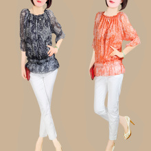 2017夏季领口松紧边印花装 七分袖女士真丝衬衫 气质桑蚕丝上衣女