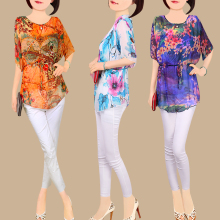 真丝衫 2017夏季印花抽带真丝上衣 中长款短袖宽松大码女桑蚕丝衫