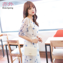 亦外雪纺连衣裙夏季清新印花韩版圆领五分花瓣袖松紧腰修身中长裙