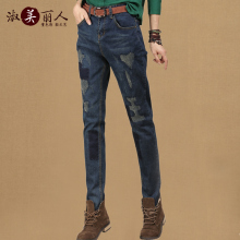 2017春季韩版宽松直筒牛仔裤女春秋高腰大码破洞显瘦休闲长裤子潮