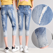 中裤夏款变色七分牛仔裤女宽松大码哈伦裤磨破洞显瘦小脚热裤短潮