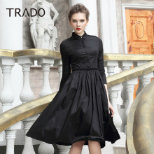 春装新款女装七分袖大摆连衣裙 娃娃翻领显瘦复古中长小黑裙子