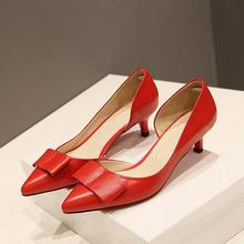 单鞋女春天2017新款尖头高跟鞋细跟红色蝴蝶结婚鞋中跟小码皮鞋女