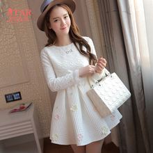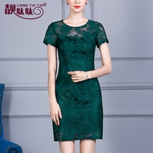 靓呔呔2017夏季新款短袖圆领修身气质连衣裙蕾丝绣花显瘦夏装裙子