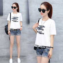 韩版宽松显瘦流苏短袖t恤女纯棉字母时尚印花学生半截袖百搭上衣