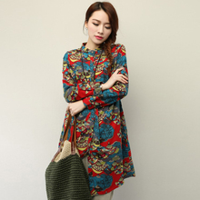 2017春装民族风花色中长款亚麻宽松大码棉麻衬衫长袖衬衣打底衫女