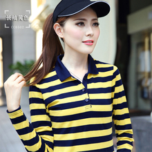 2017春季条纹翻领长袖t恤女休闲运动上衣修身中年大码打底polo衫