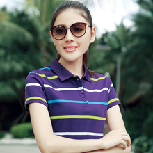 女装翻领运动条纹polo衫大码修身显瘦纯棉休闲上衣夏天短袖t恤女