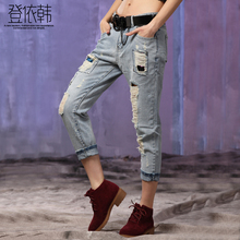 登依韩新品欧洲站个性亮片破洞铆钉大码九分哈伦垮裤女牛仔裤潮