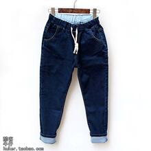 2017春装宽松牛仔裤女大码哈伦裤松紧带高腰长裤胖MM碎花卷边潮流