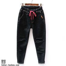 2017春装做旧黑色松紧腰小脚哈伦裤弹力女大码牛仔裤磨破补丁显瘦