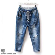2017春装大码宽松小哈伦裤女高腰牛仔裤破洞微垮裤松紧带八九分裤