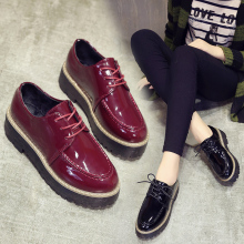 春秋新款原宿风厚底松糕跟单鞋英伦学院风女鞋系带黑色漆皮小皮鞋