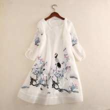 2016夏季新款女装显瘦七分袖刺绣印花白色旗袍连衣裙中裙