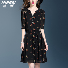 茗思2017夏季新款真丝印花连衣裙五分袖中长款收腰显瘦a字裙女装