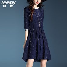 茗思2017春季新款波点印花真丝连衣裙时尚修身中袖宽松显瘦a字裙