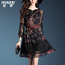 茗思2017春季新款印花雪纺连衣裙蕾丝拼接系带修身九分袖a字裙子