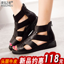 2017新款韩版罗马镂空坡跟后拉链真皮凉鞋女鞋平底鱼嘴凉鞋学院风