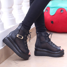 2017春夏新款厚底松糕鱼嘴鞋坡跟网纱系带罗马凉鞋皮带扣拉链女鞋