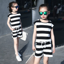 儿童装套装夏装2017新款韩版女童纯棉上衣短袖条纹两件套9-11周岁