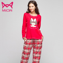 MiiOW/猫人女士春秋季纯棉长袖睡衣两件套装全棉质可爱高贵家居服