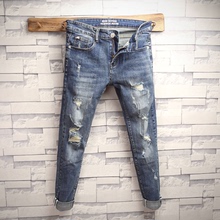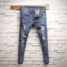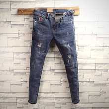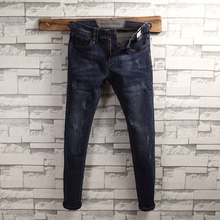 2017新款深蓝色牛仔裤小脚修身型韩版潮流刮烂设计青年紧腿铅笔裤